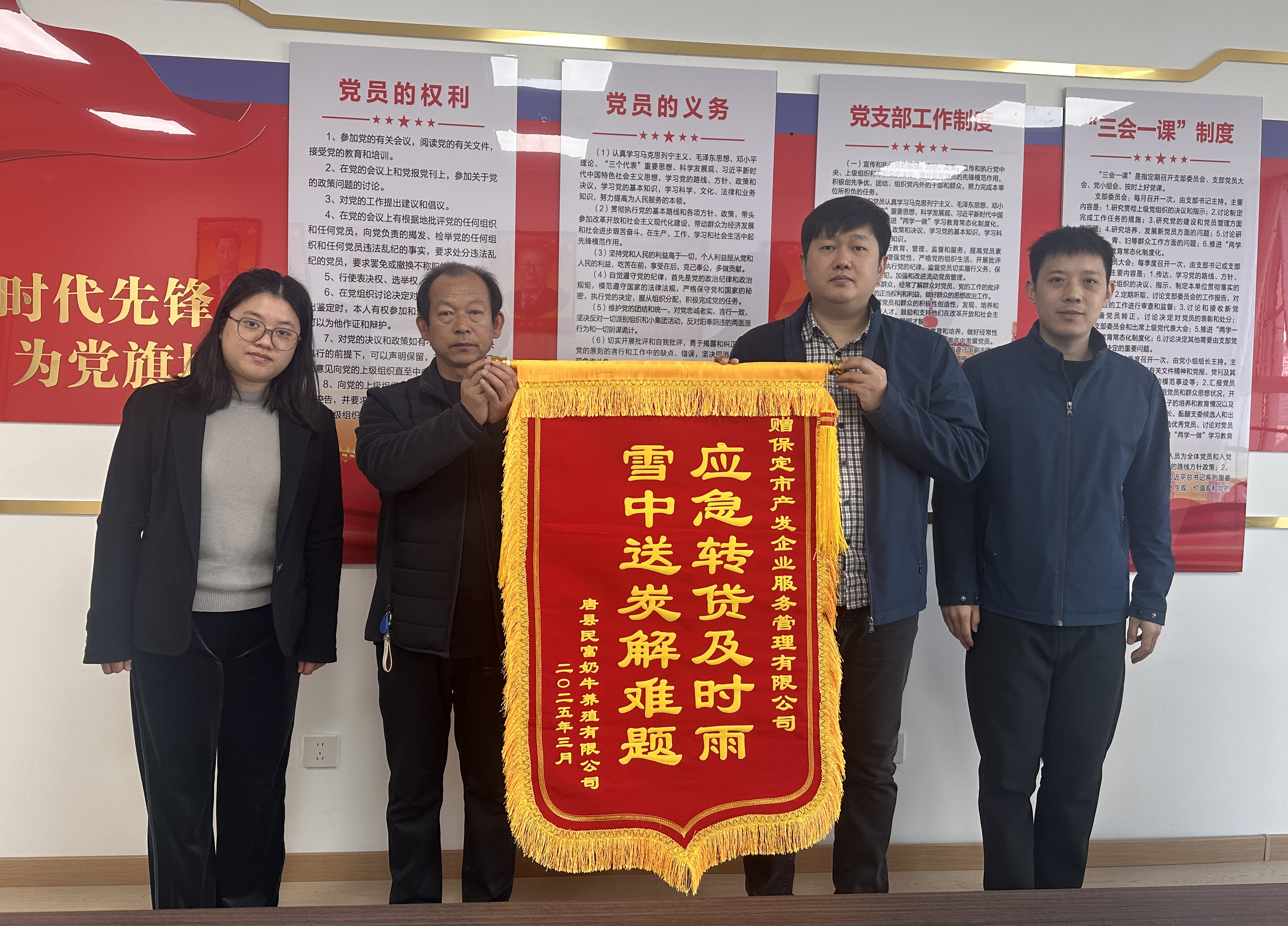 3月17日,唐縣某奶牛養(yǎng)殖有限公司負(fù)責(zé)人專程赴保定市產(chǎn)發(fā)企業(yè)管理服務(wù)有限公司贈(zèng)送錦旗。